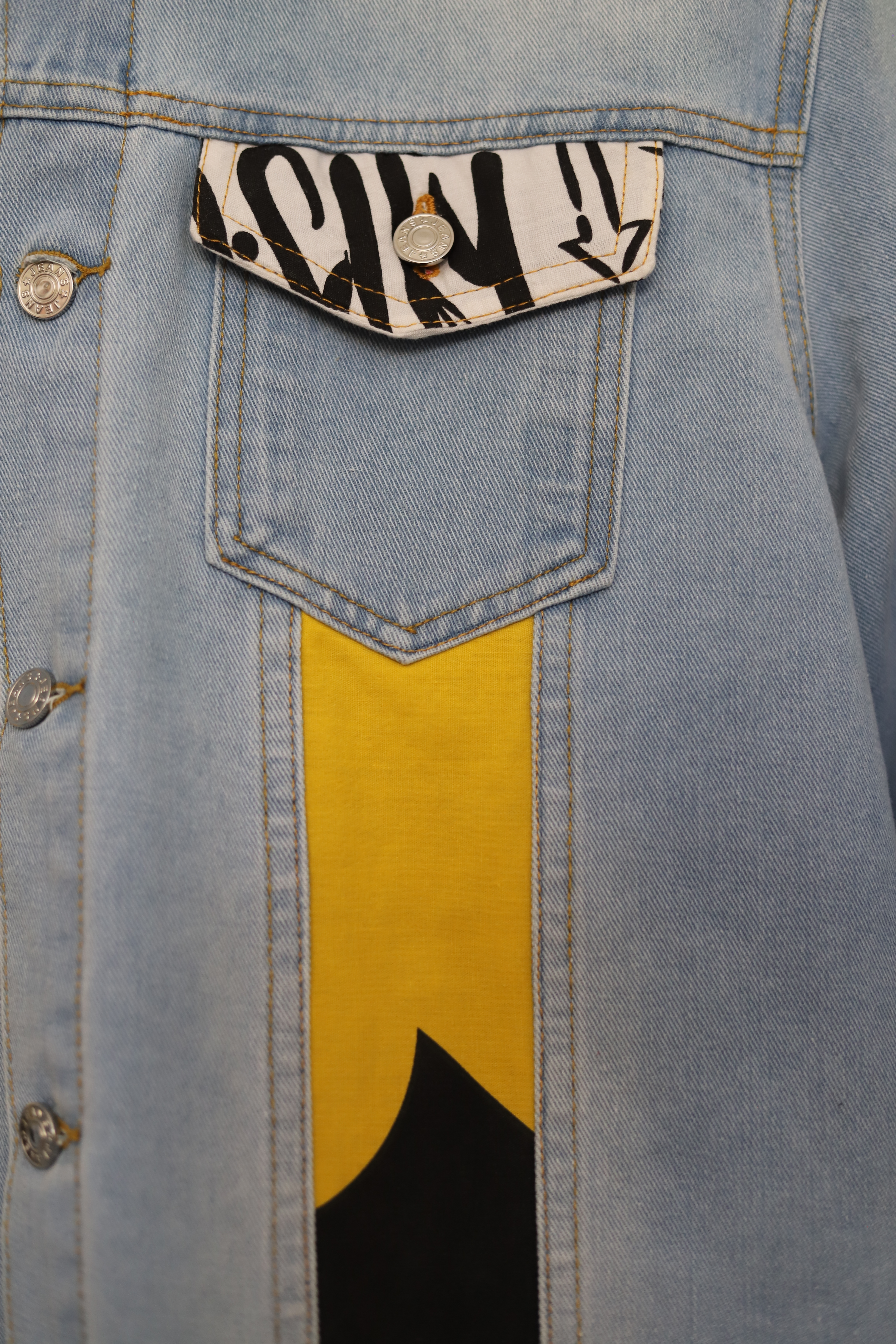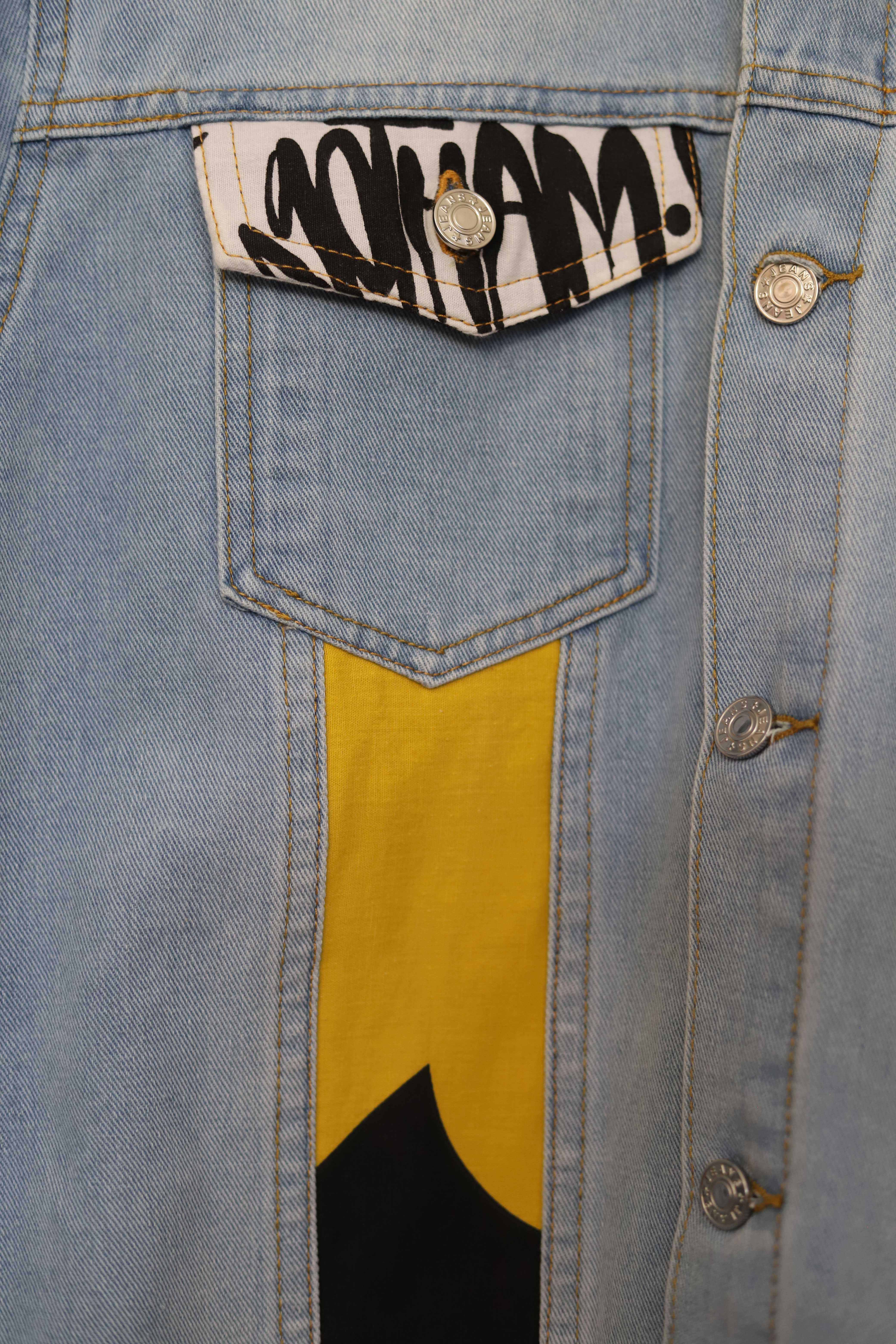 Découvre la veste customisée, une création conçue à la main à Saint-Auban, en France. Ce produit artisanal allie une veste de seconde main et d’autres tissus ou vêtements chinés, donnés ou trouvées pour donner une pièce originale et unique.
